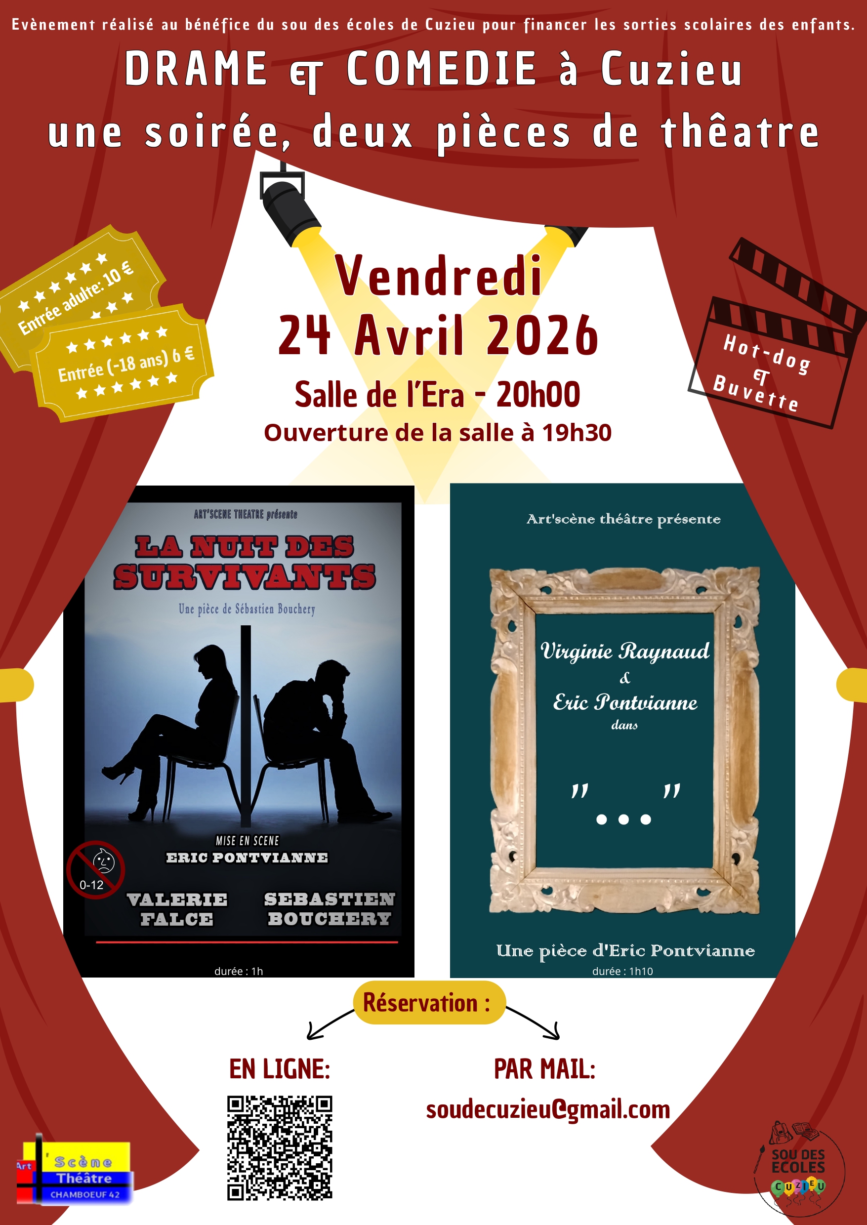 Via HelloAsso : https://www.helloasso.com/associations/sou-de-l-ecole-de-cuzieu/evenements/theatre-2-pieces-avec-la-troupe-art-scene